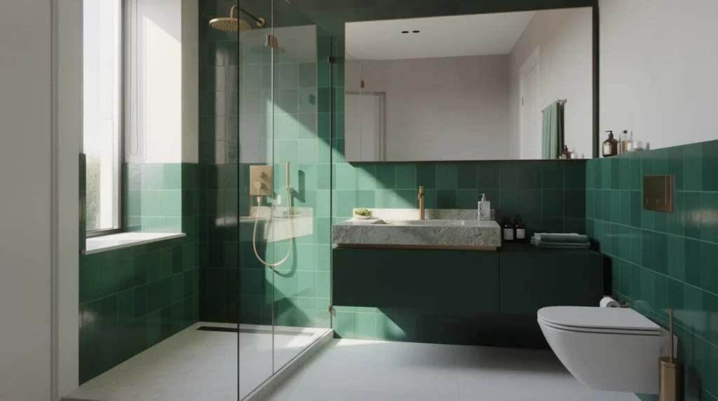Avant d’entamer vos travaux, il est essentiel de comprendre l’engouement pour la salle de bain vert emeraude. Cette couleur, à la fois profonde et lumineuse, s’inspire des pierres précieuses et de la nature luxuriante. Par ailleurs, elle évoque bien-être, fraîcheur et élégance, des qualités recherchées dans une pièce d’eau. D’autre part, le vert émeraude s’adapte aussi bien aux styles contemporains qu’aux ambiances plus classiques.